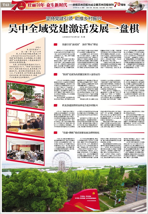 今年以来,吴中区紧扣“一核一轴一带”生产力布局,大力实施加强基层党建工作三年行动计划(2018年至2020年),努力构建“城市党建核、企业党建轴、环太湖党建带”全域党建新格局,以党建助推吴中经济社会高质量发展。