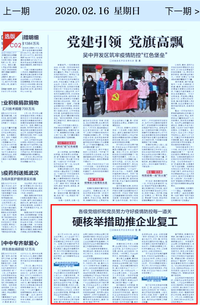 除了区级机关党组织和属地党(工)委,全区非公企业党组织也没有在抗“疫”中缺位。通过严格的自我管理、人性化的员工关爱、抗疫“一盘棋”的暖心举动,共同为打赢抗疫阻击战、推动安全平稳复工贡献正能量。春节期间,疫情动态实时更新,牵动着日立电线(苏州)有限公司党支部书记、工会主席顾建龙的心。形势越严峻,企业复工的难度就越大;难度越大,就越考验支部的战斗力和党员的凝聚力。顾建龙作为支部书记,亲自上阵加强与政府部门对接,同时兼顾好各类行政工作和相关产品的查验等等。顾建龙还第一时间在党支部发出了“集结号”,不在疫区、身体健康的党员纷纷踊跃报名。“日立电线党支部共有党员39名,支部发出号召后,13名党员迅速进入备战状态,投身各项筹备工作。”顾建龙的自豪之情不言自明。企业党组织冲锋在前的同时,还推动企业规范各项规章制度。人才企业辛德斯机器人系统工程有限公司党支部根据公司实际,牵头制定了《关于新型冠状病毒疫情防控工作的实施细则》,形成一整套防疫期间的工作流程,确保安全有序生产。2月12日,辛德斯机器人复工,目前已有40%的员工到岗,正在恢复生产。(《苏州日报》2月16日C02版)