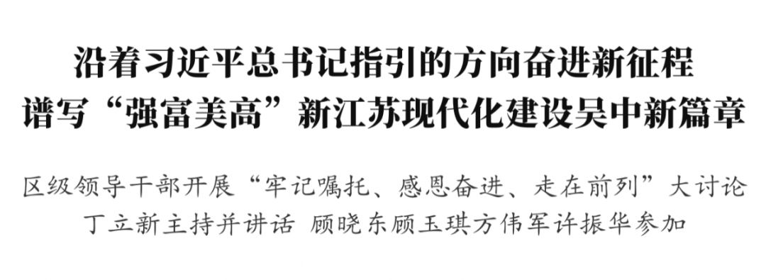 根据主题教育工作安排,今天(12月12日),区级领导干部开展“牢记嘱托、感恩奋进、走在前列”大讨论,深入学习贯彻习近平总书记对江苏、苏州工作重要讲话指示精神,围绕“走在前列的要求是什么”“我们的差距在哪里”“下一步怎么干”开展专题研讨。区委书记丁立新主持并讲话。区委副书记、区长顾晓东,区委副书记顾玉琪,区人大常委会主任方伟军,区政协主席许振华参加。