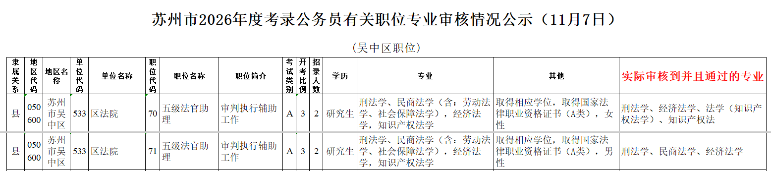 苏州市吴中区2026年度考录公务员有关职位专业审核情况公示(11月7日)