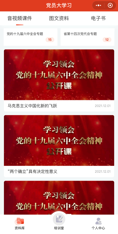 “党员大学习”分为“学习党的十九届六中全会精神”和“学习省第十四次党代会精神”专题!除了领学内容,平台还有音视频课件、图文资料、电子书等丰富内容!快一起学起来!