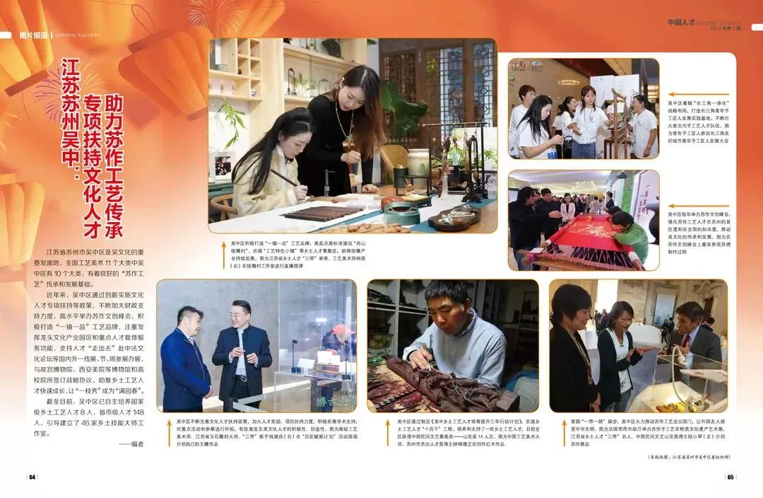 吴中区是吴文化的重要发源地,全国工艺美术11个大类中吴中区有10个大类,有着良好的“苏作工艺”传承和发展基础。近年来,吴中区通过创新实施文化人才专项扶持等政策,不断加大财政支持力度,高水平举办苏作文创峰会,积极打造“一镇一品”工艺品牌,注重发挥龙头文化产业园区和重点人才载体服务功能,支持人才“走出去”赴中法文化论坛等国内外一线展、节、周参展办展,与故宫博物院、西安美院等博物馆和高校院所签订战略协议,助推乡土工艺人才快速成长,让“一枝秀”成为“满园春”。截至目前,吴中区已自主培养国家级乡土工艺人才8人,省市级人才148人,引导建立了46家乡土技能大师工作室。